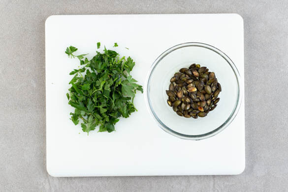 Die Kürbiskerne in einer kleinen Pfanne ohne Zugabe von Fett bei mittlerer Hitze 2–4Min. anrösten, bis sie knistern und goldbraun sind. Zum Abkühlen aus der Pfanne nehmen. Die Petersilie samt Stängeln grob hacken.