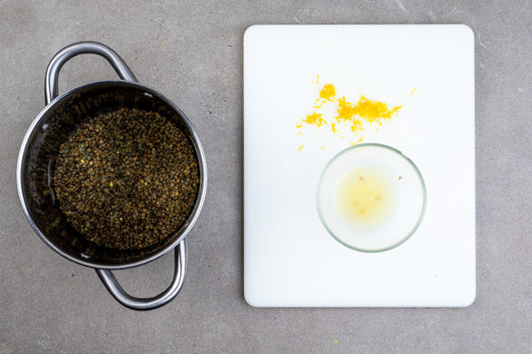 Den Backofen mit Grillfunktion auf 250°C vorheizen. In einem mittelgroßen Topf ca. 1L Wasser für die Linsen zum Kochen bringen. Sobald das Wasser kocht, die Linsen hineingeben und in 18–20Min. bissfest kochen. In ein Sieb abgießen und abtropfen lassen. Die Zitronenschale abreiben, dann die Zitrone halbieren und auspressen.