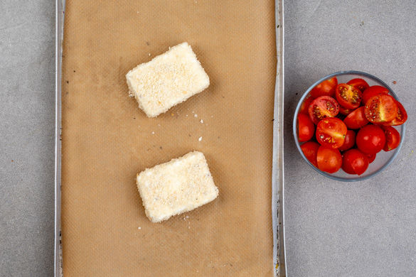 Den panierten Käse auf ein mit Backpapier ausgelegtes Backblech legen und im Ofen 3–5Min. grillen, bis die Oberfläche knusprig ist. Die Kirschtomaten halbieren und mit 1EL Olivenöl sowie Salz und Pfeffer vermengen.