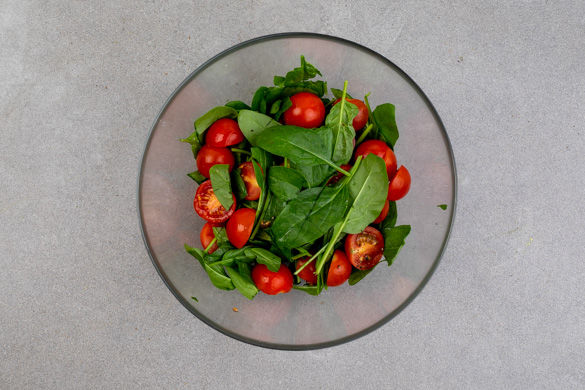 Den Spinat nach Wunsch grob schneiden und mit dem Dressing vermischen, die Tomaten unterheben.