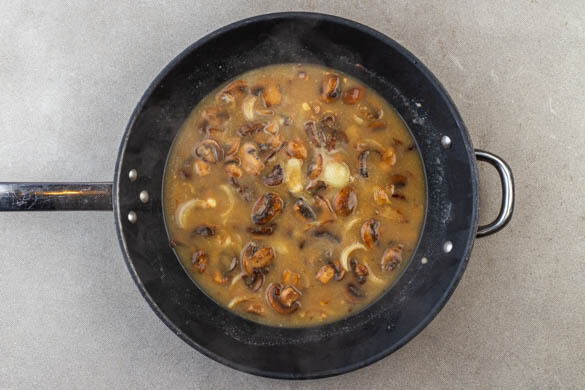 Das Brühgewürz in 500ml heißem Wasser auflösen. 2EL Mehl über die Pilze und die Zwiebeln streuen und unter ständigem Rühren 1–2Min. mitbraten, dann nach und nach und unter ständigem Rühren die Brühe angießen.