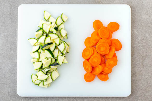 Die Karotte ggf. schälen und schräg in ca. 0,5cm breite Scheiben schneiden. Die Zucchini längs vierteln und quer in ca. 0,5cm breite Stücke schneiden.