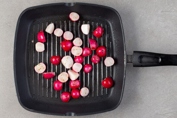 Die Grillpfanne hoch erhitzen. Tipp: Wer keine Grillpfanne hat, kann auch eine normale Pfanne verwenden. Die Radieschen mit 1EL Pflanzenöl und 1 Prise Salz vermengen. Sobald die Pfanne heiß ist, die Radieschen hineingeben und 5–6Min. grillen, bis sich leichte Röstspuren abzeichnen, dabei gelegentlich wenden. Aus der Pfanne nehmen und beiseitestellen.
