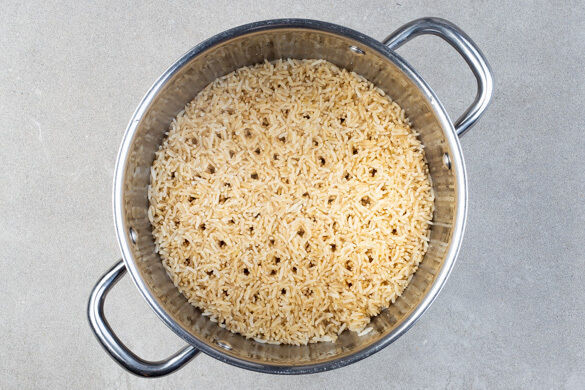 Den Reis in das kochende Wasser geben und abgedeckt bei niedrigster Hitze 8–10Min. kochen, bis das Wasser aufgesogen und der Reis gar ist. Noch ca. 5Min. ohne Hitzezufuhr ziehen lassen.