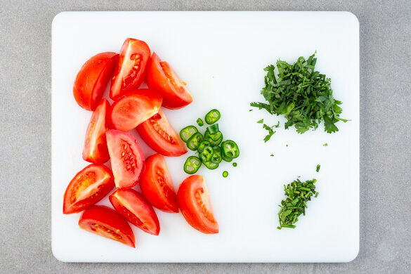 Die Tomaten jeweils in 6 Spalten schneiden. Die Korianderblätter und die Stängel separat grob schneiden. Die Peperoni in feine Ringe schneiden. Tipp: Für weniger Schärfe die Kerne entfernen.