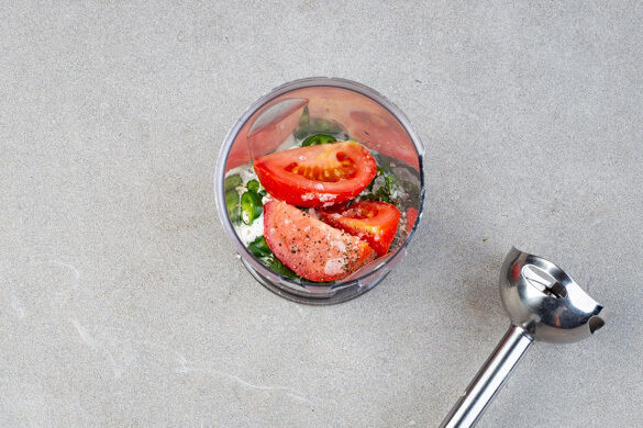 Die ½ der Peperoni oder mehr nach Geschmack in einem hohen Gefäß mit den Korianderstängeln, der ½ der Korianderblätter, den 3 Tomatenspalten, 2EL veganer Mayonnaise und je 1 Prise Salz, Pfeffer und Zucker zu einer Sauce pürieren. Die Tofu-Gemüse-Pfanne auf dem Reis anrichten, mit der Sauce beträufeln und mit dem restlichen Koriander garniert servieren.