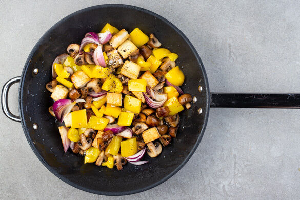 Inzwischen die Paprika, die Pilze und die Zwiebeln in einer großen Pfanne mit 1EL Pflanzenöl bei starker Hitze 4–6Min. anbraten, bis das Gemüse leicht gebräunt ist. Den Tofu in ca. 2cm große Würfel schneiden, mit 1 kräftigen Prise Salz dazugeben und bei mittlerer Hitze 4–5Min. mitbraten.