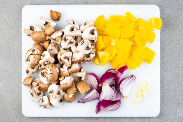 In einem mittelgroßen Topf 600ml leicht gesalzenes Wasser für den Reis zum Kochen bringen. Die Paprika vierteln, entkernen und in ca. 2cm große Stücke schneiden. Die Pilze vierteln. Die Zwiebel schälen, halbieren und in dünne Spalten schneiden. Den Knoblauch schälen und fein würfeln.