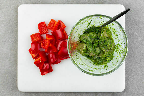 Das Fleisch trocken tupfen und mit 2EL Pesto, 2EL Olivenöl und je 1 kräftigen Prise Salz und Pfeffer vermengen. Die Paprika vierteln, entkernen und ebenfalls in ca. 2cm große Würfel schneiden.