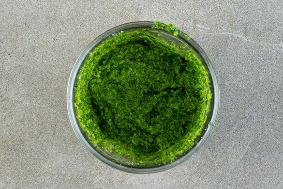 Die ½ des Rucolas mit den Sonnenblumenkernen, dem Knoblauch, dem Basilikum samt Stängeln, der ½ des Käses, 4EL Olivenöl, 2EL hellem Essig und 5–6EL Wasser in einem hohen Gefäß mit einem Stabmixer zu einem glatten Pesto pürieren. Mit je 1TL Salz und Pfeffer würzen, ggf. mehr Wasser hinzufügen.