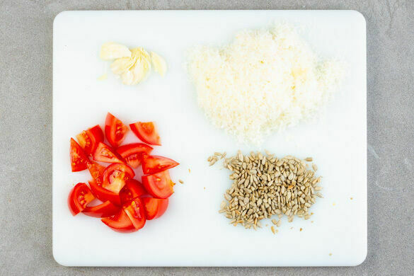 Den Backofen auf 220°C (200°C Umluft) vorheizen. Die Sonnenblumenkerne in einer großen Pfanne ohne Zugabe von Fett bei mittlerer Hitze 1–2Min. goldbraun anrösten. Vorsicht, sie können schnell zu dunkel werden. Zum Abkühlen aus der Pfanne nehmen. Die Tomaten grob würfeln. Den Knoblauch schälen und grob zerdrücken. Den Käse fein reiben.