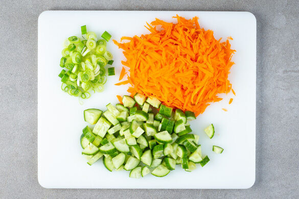 Die Lauchzwiebel in dünne Ringe schneiden. Die Karotte ggf. schälen und grob raspeln. Die Gurke längs vierteln und in 1–2cm große Stücke schneiden.