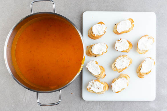 Währenddessen das Baguette in Scheiben schneiden und auf ein mit Backpapier ausgelegtes Blech geben, mit 1EL Olivenöl beträufeln und mit je 1 Prise Salz und Pfeffer würzen. Im Ofen in 7–8Min. knusprig backen. Den Feta in einem hohen Gefäß mit 1EL Mayonnaise, 1–2TL Wasser und 1 kräftigen Prise Pfeffer mit einem Stabmixer zu einer glatten Creme pürieren, mit Salz und Pfeffer abschmecken.