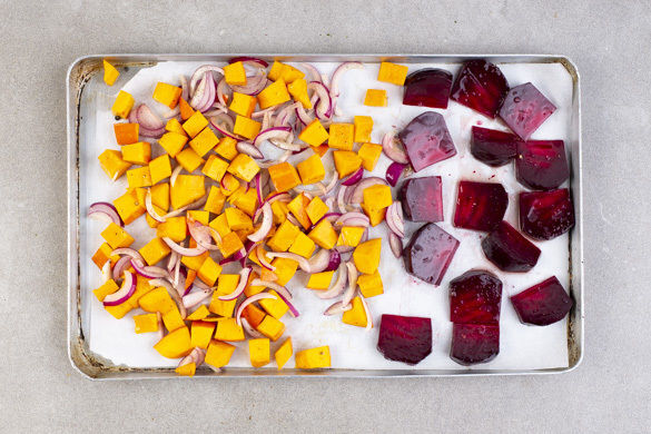Den Backofen auf 240°C (220°C Umluft) vorheizen. Den Kürbis halbieren, entkernen und in 1–2cm kleine Würfel schneiden. Die Rote Bete schälen und in ca. 1cm breite Spalten schneiden. Tipp: Am besten Küchenhandschuhe und Schürze tragen, da die Rote Bete stark färbt. Die Zwiebel schälen, halbieren und in feine Streifen schneiden.
