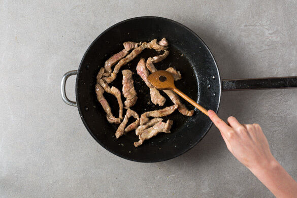 Das Fleisch in einer großen Pfanne mit 1EL Pflanzenöl bei starker Hitze 3–4Min. anbraten. Auf einem Teller abgedeckt warm halten.