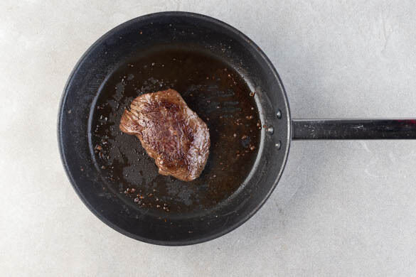Eine mittelgroße Pfanne bei starker Hitze erwärmen. Das Fleisch trocken tupfen, horizontal halbieren und mit Salz und Pfeffer würzen, dann mit 1EL Olivenöl auf jeder Seite 3–4Min. scharf anbraten, je nach Dicke des Fleisches. Das Fleisch abgedeckt auf einem Teller ca. 5Min. ruhen lassen.