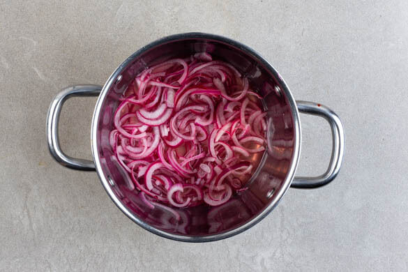 Die Zwiebel schälen, halbieren und in feine Streifen schneiden. In einem kleinen Topf 2EL Wasser, 2EL Essig, ½TL Zucker und 1 Prise Salz bei starker Hitze ca. 2Min. erwärmen, bis der Zucker sich auflöst. Die Zwiebeln in den Einlegesud geben und beiseitestellen.