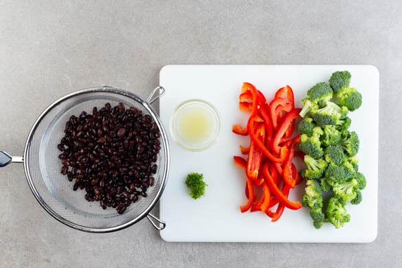 Den Brokkoli und die Paprika in einer großen Pfanne mit 2EL Olivenöl bei mittlerer bis starker Hitze ca. 5Min. anbraten, dann die Bohnen mit 4EL Wasser hinzufügen und 3–4Min. mitkochen, bis der Brokkoli gar ist. Das Gemüse mit der Limettenschale, Salz und Pfeffer abschmecken.