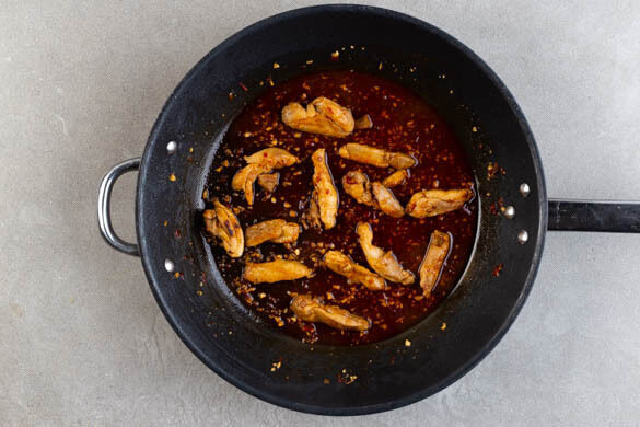 Den Knoblauch schälen und fein reiben oder durch eine Knoblauchpresse drücken. Den Limettensaft mit dem Knoblauch, der Sojasauce und 4EL Wasser verrühren. Die Sauce in die Pfanne zu dem Fleisch gießen und ca. 1Min. erhitzen.