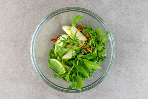 Den Apfel ggf. schälen, vierteln, entkernen und in ca. 0,5cm dünne Scheiben schneiden. Die Pekannusskerne grob hacken.