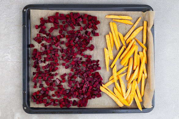 Den Backofen auf 240°C (220°C Umluft) vorheizen. Die Süßkartoffel schälen und in ca. 0,5cm dünne, pommesartige Stifte schneiden. Die Roten Beten schälen und in 0,5cm große Würfel schneiden. Das Gemüse separat auf einem mit Backpapier ausgelegten Backblech mit insgesamt 2EL Olivenöl beträufeln, mit je 1 kräftigen Prise Salz und Pfeffer würzen und 13–15Min. im Ofen rösten.