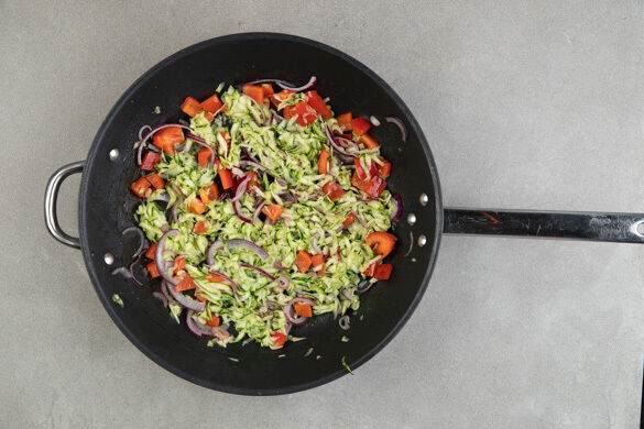 Die Paprika und die ½ der Zwiebeln in einer großen Pfanne mit 1EL Olivenöl bei mittlerer bis starker Hitze 3–5Min. anbraten, bis die Zwiebeln weich und glasig sind. Mit den Händen möglichst viel Flüssigkeit aus den Zucchiniraspeln drücken, dann die Zucchini in die Pfanne geben und ca. 3Min. mitbraten. Das Gemüse auf einem Teller beiseitestellen. Die Pfanne aufbewahren.