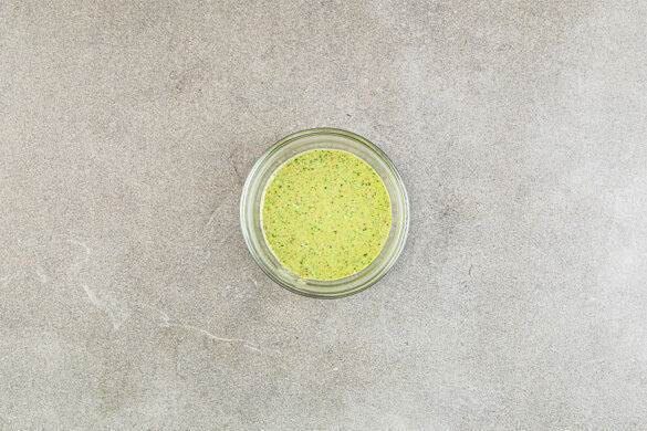 Das Basilikum samt Stängeln grob schneiden und mit dem Knoblauch, der ½ der Sonnenblumenkerne, den Hefeflocken und 2EL Zitronensaft in ein hohes Gefäß geben. 4EL Olivenöl und 4EL Wasser angießen, dann alles mit einem Stabmixer möglichst cremig pürieren. Das Pesto mit Salz und Pfeffer abschmecken.