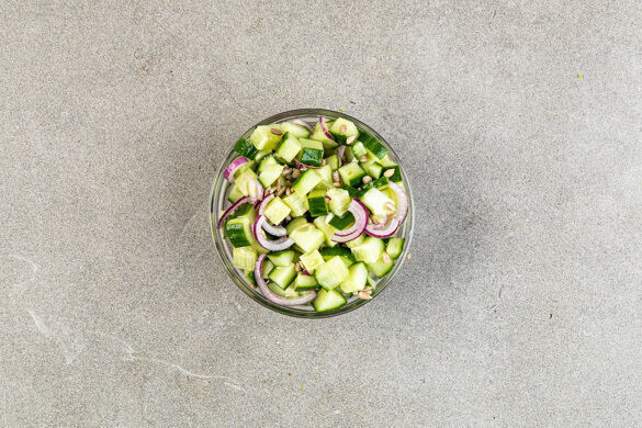 2EL Zitronensaft mit 2EL Olivenöl und 2TL Zucker verrühren. Die Gurke in ca. 1cm große Würfel schneiden, dann mit den restlichen Zwiebeln, den übrigen Sonnenblumenkernen und dem Dressing vermengen. Den Salat mit Salz und Pfeffer abschmecken. Die Zucchini-Pesto-Piadine auf Teller verteilen und mit dem Gurkensalat servieren.