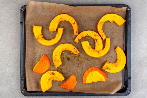 Den Backofen auf 230°C (210°C Umluft) vorheizen. Den Kürbis halbieren, entkernen, in 1–2cm dicke Scheiben schneiden und auf einem mit Backpapier ausgelegten Backblech mit 1EL Olivenöl, der ½ der Gewürzmischung und 1 Prise Salz vermengen.