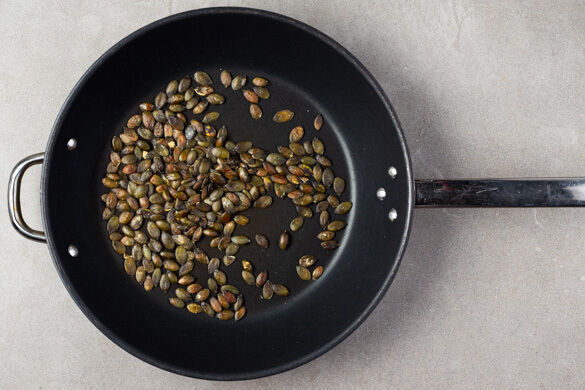 Die Kürbiskerne in einer mittelgroßen Pfanne ohne Zugabe von Fett bei mittlerer Hitze 2–4Min. anrösten, bis sie knistern und goldbraun sind. Zum Abkühlen aus der Pfanne nehmen.
