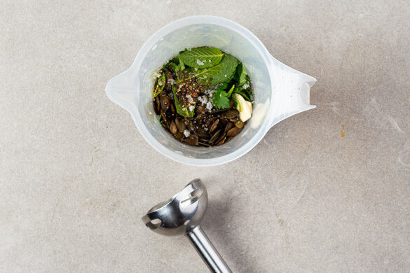 Die Petersilie samt Stängeln grob schneiden. Die Minzeblätter abzupfen. Den Knoblauch schälen und halbieren. Die Zitrone halbieren und auspressen. Die Oliven in Ringe schneiden.