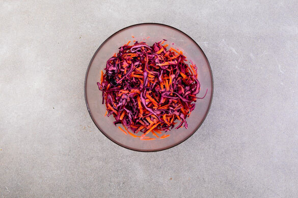 Den Rotkohl in feine Streifen schneiden. Die Karotte ggf. schälen, grob raspeln und mit dem Rotkohl vermengen. 1EL Einlegsud von den Zwiebeln dazugeben und die Karotten und den Rotkohl ca. 1Min. gründlich durchkneten, dabei am besten Küchenhandschuhe tragen. Den Salat mit 1EL Einlegsud und 1EL Mayonnaise verfeinern.