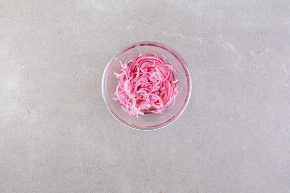 Die Zwiebel schälen und halbieren, eine Hälfte in dünne Streifen schneiden. Die Limette halbieren und auspressen. Die Zwiebeln mit der ½ des Limettensaftes, 2EL Essig, 1TL Zucker und 1 kräftigen Prise Salz verrühren und ziehen lassen.