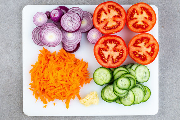 Die Tomaten quer halbieren. Die Zwiebel schälen und in ca. 1cm dicke Scheiben schneiden. Die Karotte ggf. schälen und grob raspeln. Die Gurke in dünne Scheiben schneiden. Den Knoblauch schälen und fein reiben.
