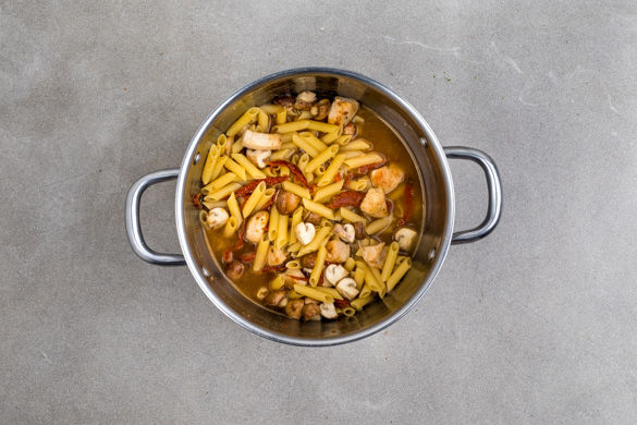 Heute dauert es nicht lange, bis du dieses leckere Pastagericht mit saftigen Hähnchenstücken, frischen Champignons, würzigen getrockneten Tomaten und herzhaftem Rucola auf dem Tisch stehen hast, wo sich dann alle hungrig daraufstürzen werden. Und weil es ein One-Pot-Gericht ist, musst du anschließend auch nicht lange aufräumen.