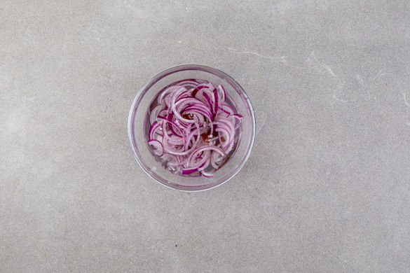 Die Zwiebel schälen, halbieren und in feine Streifen schneiden. Mit den Rosinen in eine kleine Schüssel geben und in ausreichend lauwarmem Wasser einweichen.