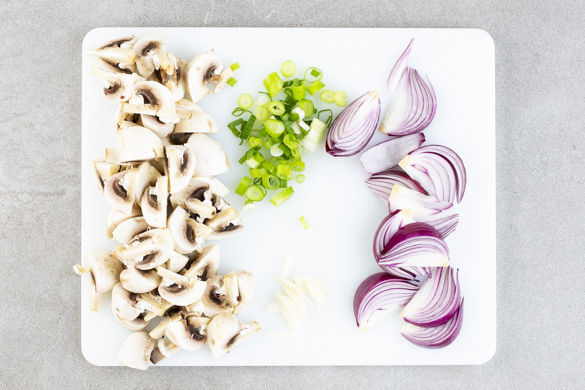 Den Backofen auf 200°C Umluft (220°C Ober-/Unterhitze) vorheizen. Die Pilze putzen und in ca. 1cm kleine Spalten schneiden. Die Lauchzwiebel in feine Ringe schneiden. Die Zwiebel schälen, halbieren und in 1,5–2cm breite Spalten schneiden. Den Knoblauch schälen und in dünne Stifte schneiden.