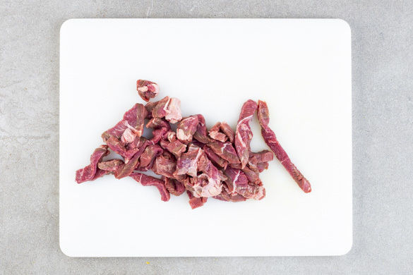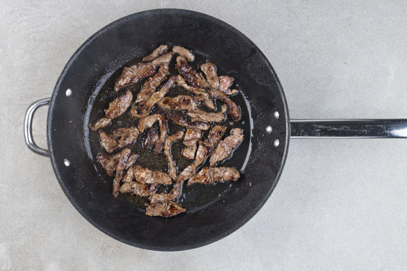 Das Fleisch mit Salz und Pfeffer würzen, dann in einer großen Pfanne mit 1–2EL Olivenöl bei starker Hitze ca. 1Min. scharf anbraten. Auf einem Teller beiseitelegen.