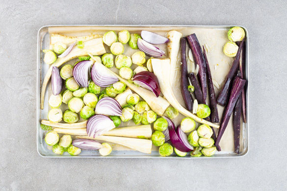 Die Petersilienwurzeln und die Karotten schälen und längs vierteln. Die äußeren Rosenkohlblätter entfernen, dann den Rosenkohl halbieren. Die Petersilienwurzeln, die Karotten, den Rosenkohl, die Zwiebeln und den Knoblauch mit 1–2EL Olivenöl sowie je 1TL Salz und Zucker vermengen und auf einem mit Backpapier belegten Backblech ca. 15Min. im Ofen rösten.