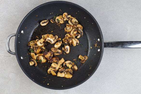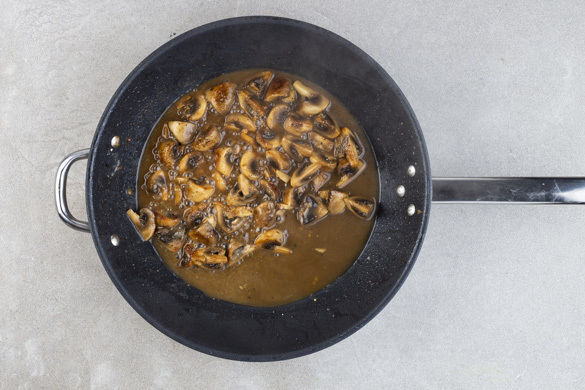 Die Pilze in derselben Pfanne mit 1–2EL Olivenöl bei starker Hitze 2–3Min. scharf anbraten. Mit 2TL Mehl bestäuben und mit 150–200ml Wasser und der Worcestershiresauce ablöschen.