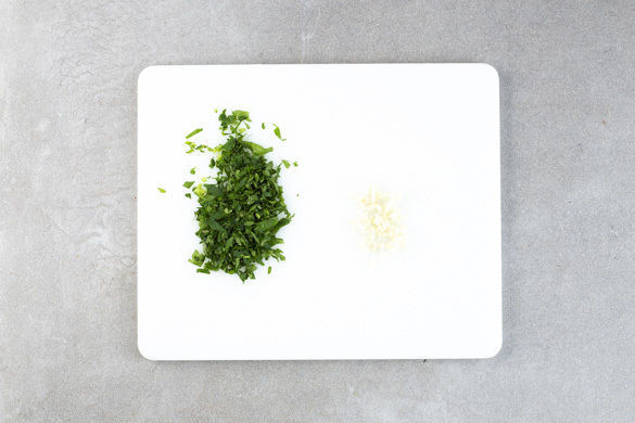Die Petersilie samt Stängeln fein hacken. Den Knoblauch schälen, halbieren und in feine Würfel schneiden.