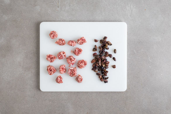 Die Salsiccia mit einem scharfen Messer pellen und in 0,5–1cm dicke Scheiben schneiden. Die Oliven halbieren oder in kleine Stücke schneiden.