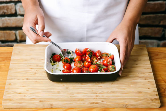 Die Tomaten halbieren und mit dem Knoblauch, der 1/2 des Thymians und 1–2EL Olivenöl in einer Auflaufform vermengen. Mit Salz, Pfeffer und 1 Prise Zucker würzen und die Tomaten 10–12Min. im Ofen backen.