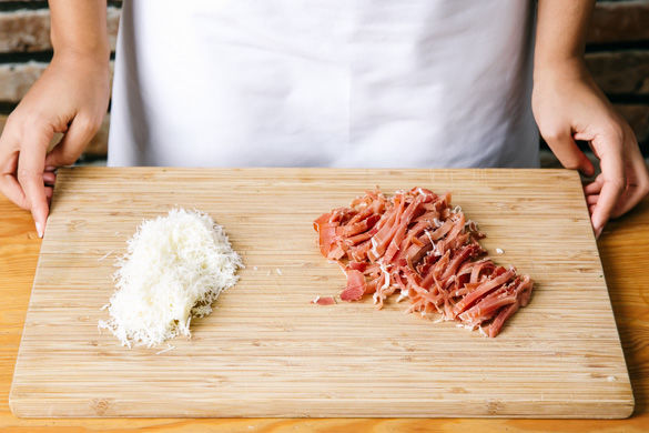 In der Zwischenzeit den Käse fein reiben. Den Schinken in feine Streifen schneiden.