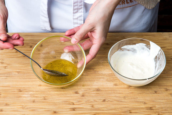 Die Mayonnaise mit 2EL Zitronensaft sowie Salz und Pfeffer verrühren. In einer weiteren kleinen Schüssel 1–2EL Zitronensaft mit 2EL Olivenöl, 1EL (hellem) Essig sowie je 1 Prise Salz, Pfeffer und Zucker verrühren.