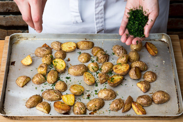 Die Dillspitzen abzupfen, grob schneiden und unter die gebackenen Kartoffeln mengen.