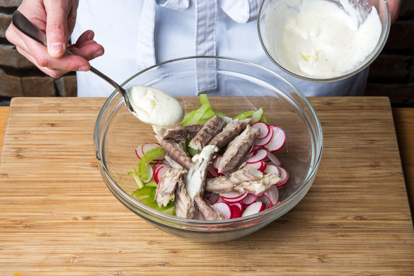 Die Makrele mit den Chicoréestreifen, dem Sellerie, den Radieschen und dem Mayonnaisedressing vermengen.