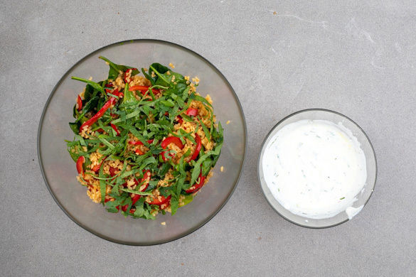 Die Zitronenschale abreiben, dann die Zitrone halbieren und auspressen. Den Bulgur mit der Paprika und dem Spinat vermengen und mit 1–2EL Olivenöl und 1–2EL Zitronensaft würzen.