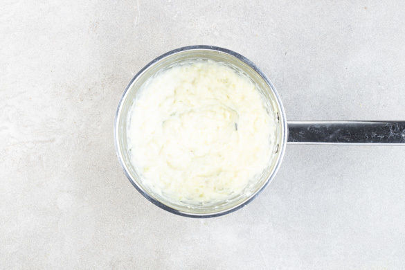 Den Backofen auf 180°C Umluft (200°C Ober-/Unterhitze) vorheizen. Die Milch in einem kleinen Topf erwärmen. Die Zwiebel und den Knoblauch schälen, fein würfeln und in einem mittelgroßen Topf mit 25g Butter bei mittlerer Hitze farblos anschwitzen. Mit 25g Mehl bestäuben, dann die Milch langsam unter Rühren angießen.