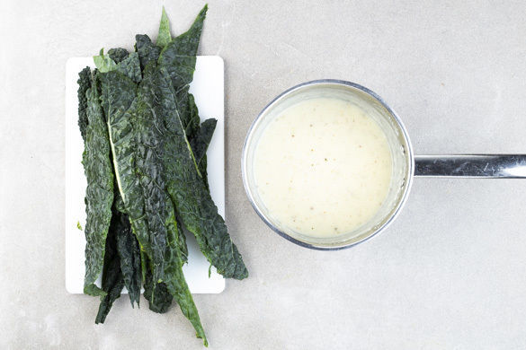 Jedes Lasagneblatt mit 2–3EL Béchamelsauce bestreichen und mit 2–3 Kohlblättern belegen. Die Lasagneblätter jeweils von der kurzen Seite aufrollen und in der Auflaufform platzieren. Den restlichen Schwarzkohl in feine Streifen schneiden, in die Béchamelsauce rühren und diese auf den Cannelloni verteilen. Die Cannelloni ca. 15Min. im Ofen backen.
